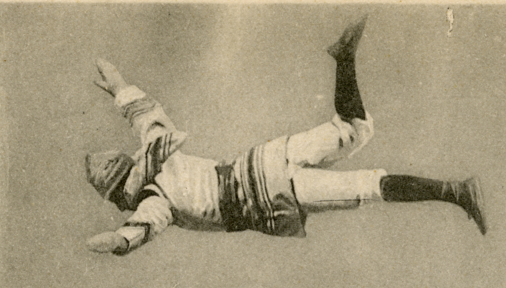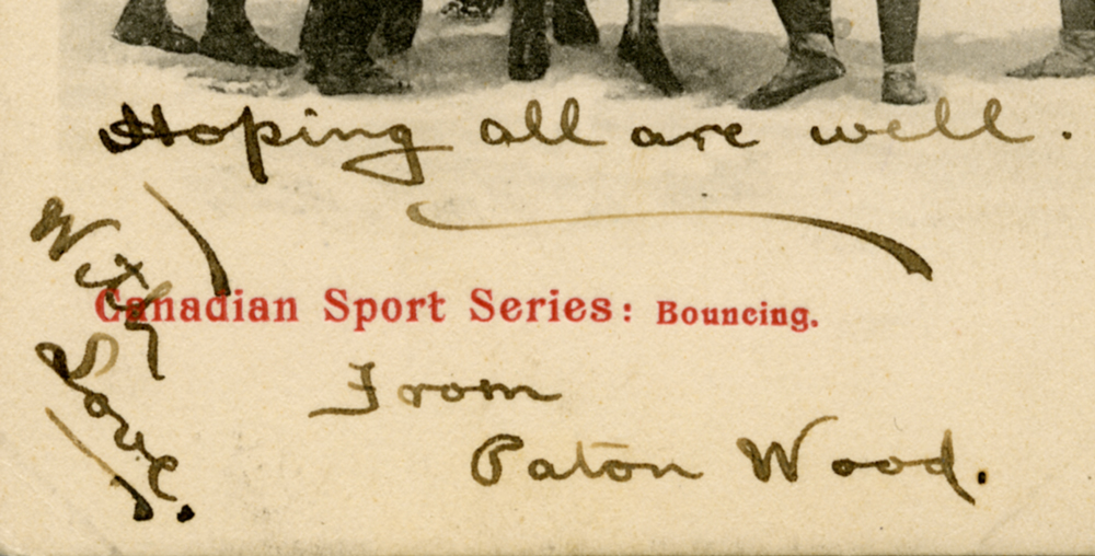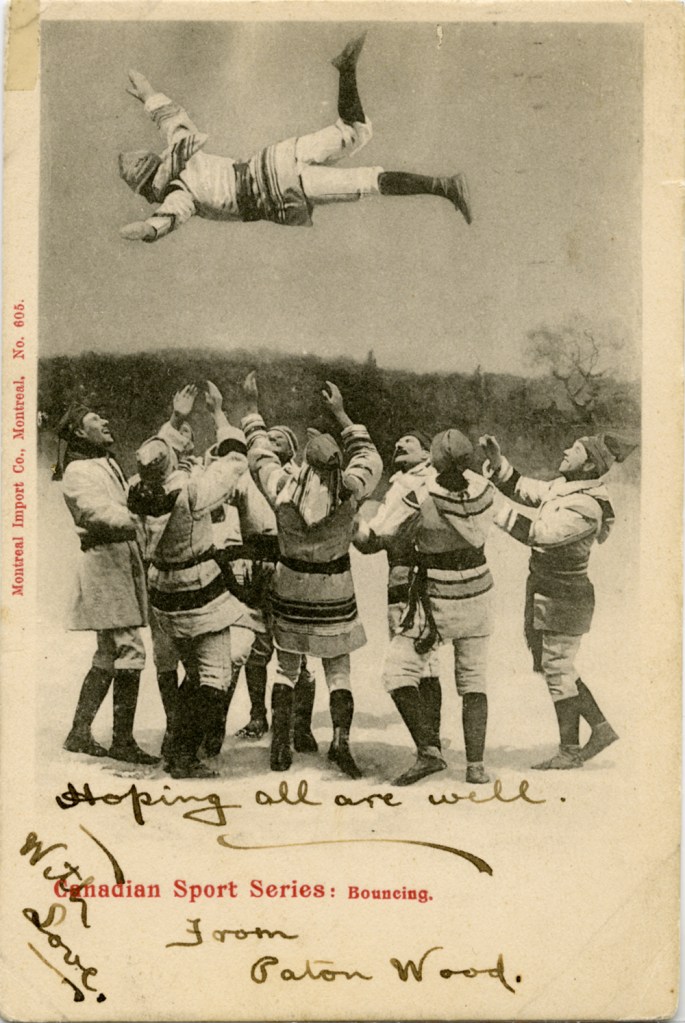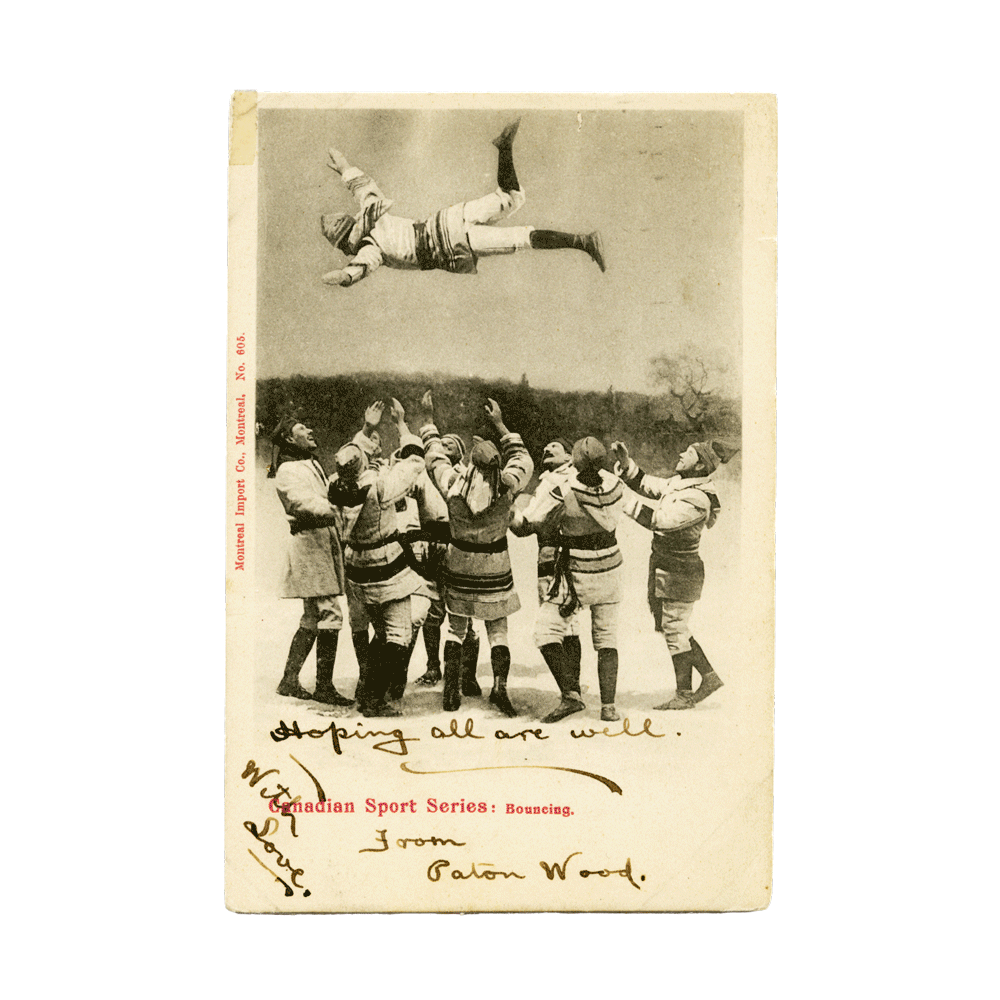 The iconic “bounce” reproduced on this postcard—first immortalized in 1886 by the Notman & Son studio—depicts a festive scene at the Montréal Snowshoe Club.