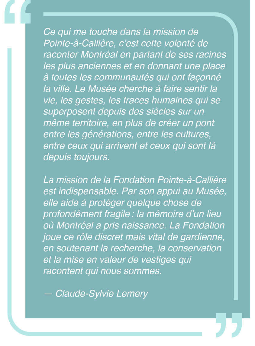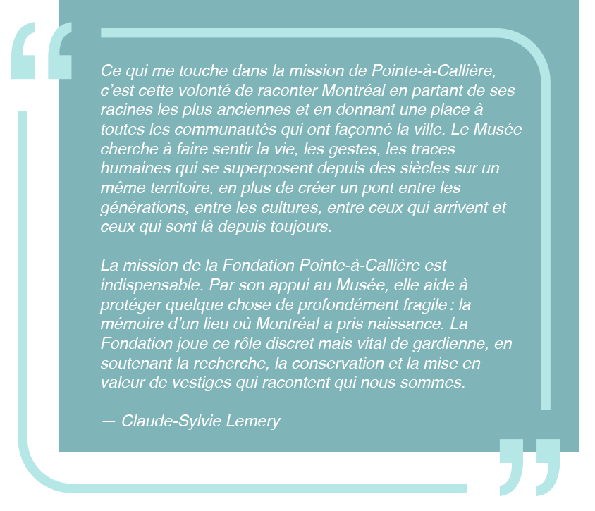 À Pointe-à-Callière, chaque don porte la conviction que notre histoire collective mérite d’être préservée, étudiée et transmise avec justesse et ambition.